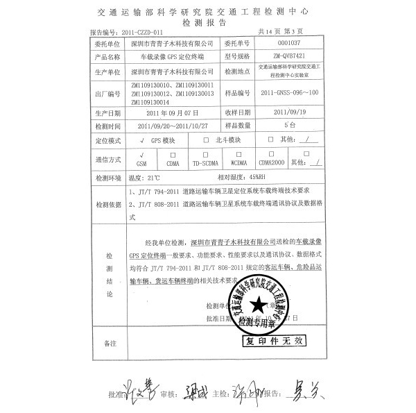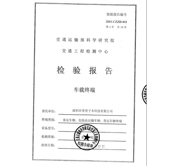 热烈庆祝青青子木车载录像机通过交通部卫星定位终端权威认证。